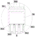 2. The system according to claim 1, wherein the system comprises: clearance mechanism (37) including clearance frame (371), rotor plate (372), auxiliary spring (373) and arc (374), top clearance frame (371) install on lifter plate (32) lower extreme face, below clearance frame (371) install on clearance board (31) preceding terminal surface, clearance frame (371) inside has rotor plate (372) through the round pin hub connection, be connected with auxiliary spring (373) between rotor plate (372) and clearance frame (371), arc (374) are installed to rotor plate (372) the inner, arc (374) evenly are provided with the clearance brush in arc (374).