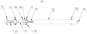 作动杆71沿朝向推动杆72的方向还依次套设有流通件76、第二密封圈77、第二限位座78以及第二弹簧79。流通件76与作动杆71滑动配合,流通件76的外侧壁与轴向孔132靠近中体11的孔口壁螺纹连接,流通件76设有多个与轴向孔132平行的通孔761,用于介质的流通。第二密封圈77和第二限位座78均与作动杆71滑动配合,第二密封圈77与第二限位座78固定连接,通过第二限位座78对第二密封圈77进行固定,第二密封圈77还与流通件76接触,用于堵塞通孔761,对轴向孔132流动的介质具有缓冲作用,同时还具有防止回流的作用。第二弹簧79的两端分别与第二限位座78和推动杆72接触,通过第二弹簧79的弹簧力实现第二密封圈77与流通件76之间的接触。