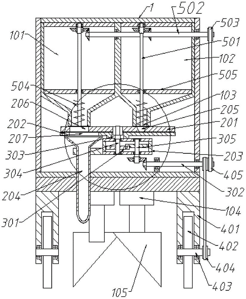 1. the fertilizer box comprises a box body shell, 101, a fertilizer box, 102, a seed box, 103, a seed discharge hole, 104, a connecting column, 105, a plough head, 106, a fertilizer discharge hole, 201, a throttle disc, 202, a discharge disc, 203, an installation box, 204, a discharge hopper, 205, a first through hole, 206, a second through hole, 207, a third through hole, 301, a sheave mechanism, 302, a first transmission shaft, 303, a central through hole, 304, an output shaft, 305, an input shaft, 401, a connecting frame, 402, wheels, 403, a second transmission shaft, 404, a first belt pulley, 405, a second belt pulley, 501, a spiral pushing rod, 502, a third transmission shaft, 503, a third belt pulley, 504, spiral blades and 505 connecting rods.