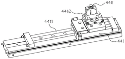 如图8所示,弹片搬移组件45包括搬移驱动元件451和搬移头452;搬移驱动元件451固定在工作台上,搬移驱动元件451输出端与搬移头452相连接;搬移头452输出端与弹片相接触,并且搬移头452在搬移驱动元件451带动下分别与下模具头442和治具输送装置1弹片压装工位相衔接。