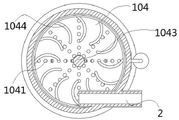 优选地,进料管道2一端延伸并连通至粗滤舱101内部,进料管道2位于粗滤盘104上方,使得废水进入粗滤舱101时,利用水流冲击涡片1044,使粗滤盘104旋转,能够废水在粗滤盘104表面均匀分布,使得粗滤过程更加均匀。