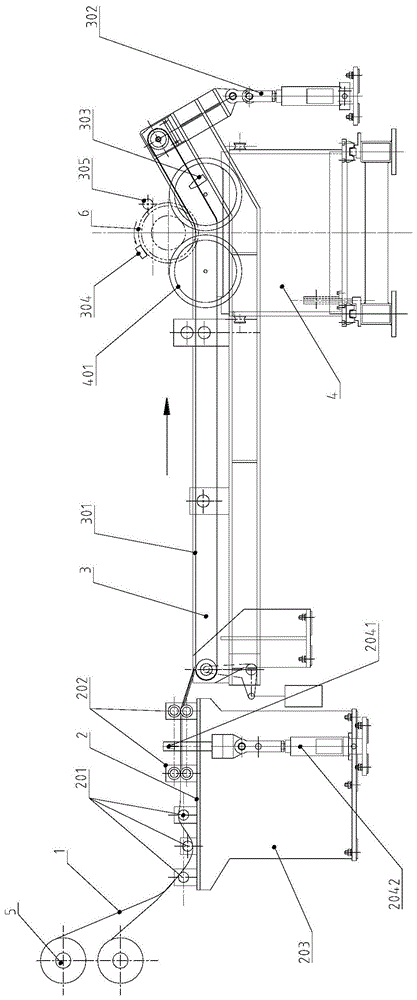 图中:1.薄膜 2.薄膜引入及定尺裁剪系统 201.引导辊 202.夹送辊 203.支座2041.裁剪刀 2042.举升装置二 3.薄膜输送及覆膜系统 301.输送带式床体 3011.输送带3012.输送带辊 3013.输送带驱动电机 302.举升装置一 303.压缩空气喷头 304.涂油器305.压辊 4.轧辊支撑旋转系统 401.托辊 402.旋转驱动电机 5.薄膜卷架 6.轧辊In the picture: 1.