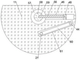 有益地,所述固定块51的右侧面固设有滑板48,所述滑板48的右侧面与所述U型腔46的右壁间固定安装有推动弹簧47,所述U型腔46靠后侧位置的左侧连通设有圆形腔57,所述旋转腔40的后壁固设有固定柱58,所述固定柱58前侧延伸部分贯穿所述半圆导轨板11的内壁,并伸入所述圆形腔57内,所述固定柱58与所述半圆导轨板11内壁转动连接,所述固定柱58内设有开口朝有的卡槽59,所述滑板48的左侧面固设有拉杆56,所述拉杆56左侧延伸部分伸入所述圆形腔57内,且能伸入所述卡槽59内,所述U型腔46的下侧连通设有移动腔49,所述固定块51的底面固设有螺纹块50,所述螺纹块50与所述移动腔49内壁滑动连接,所述移动腔49的右壁转动设有横向螺杆45,所述横向螺杆45贯穿所述螺纹块50,并与所述螺纹块50内壁螺纹连接,所述移动腔49的右侧开设有齿轮腔42,所述齿轮腔42的后壁转动设有传动轴44,所述横向螺杆45右侧延伸部分伸入所述齿轮腔42内,所述横向螺杆45与所述传动轴44之间传动连接设有传动锥齿轮组43,所述弧形腔19的后壁转动设有齿轮轴21,所述齿轮轴21的外周固设有控制齿轮20,所述控制齿轮20与所述移动弧形齿条36啮合,所述弧形腔19的后侧开设有皮带腔60,所述皮带腔60位于所述齿轮腔42后侧,所述齿轮轴21和所述传动轴44后侧延伸部分均位于所述皮带腔60内,位于所述皮带腔60内的所述齿轮轴21和所述传动轴44之间传动连接设有传动皮带组61,当所述一阶导轨壳12移动至与所述弧形板52接触时,所述第一卡块65与所述第二卡块53卡扣连接,从而可使所述第二卡块53带动所述第一卡块65向左移动,继而可使所述插杆66向左移动打开,此时加大向右的拉力,可使所述工型滑轮13带动所述一阶导轨壳12再次向右移动,此时可使所述一阶导轨壳12带动所述弧形板52和所述固定块51向右移动,从而可使所述滑板48带动所述拉杆56向右移动,进而可使所述拉杆56离开所述卡槽59,则可使所述半圆导轨板11能够正常转动,同时,所述固定块51向右移动能带动所述螺纹块50向右移动,从而可使所述横向螺杆45带动所述传动轴44正转,进而可使所述传动皮带组61带动所述齿轮轴21正转,则可使所述控制齿轮20带动所述移动弧形齿条36向左侧移动,继而可使所述支撑台41向下拉动所述第二卡块53,从而可使所述第二卡块53带动所述第一卡块65和所述封闭板17向所述弧形腔19侧转动,此时可使所述工型滑轮13抵接所述定向滑轨15和所述封闭板17转动,则可使所述半圆导轨板11受力顺时针转动,继而可使固定连接在所述工型滑轮13前侧的物件转动至竖直状态,同时,所述半圆导轨板11顺时针转动,可通过所述滑动弧形齿条24、所述控制齿轮31带动所述移动齿条28向右移动。