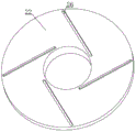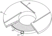Embodiment 8, on the basis of embodiment 1, referring to fig. 6, the positioning and clamping device includes a rotary table 22 rotatably installed in the inspection table 1, and the lower half portion of the rotary table 22 is provided with a first tooth system 24, and the first tooth system 24 is engaged with a positioning gear 25 driven by a positioning motor 23 fixedly installed on the inspection table 1, the positioning motor 23 is connected with an external power source and electrically connected with a first controller, the forward and reverse rotation of the positioning motor 23 and the driving sequence of the positioning motor 23 and the inspection motor 4 can be controlled by the first controller, we have a plurality of inclined sliding slots 26 on the rotary table 22 at intervals, and positioning blocks 66 are slidably fitted in the sliding slots 26 (the distribution of the sliding slots 26 is shown in fig. 7), and we also have a plurality of straight slots 27 along the radial direction thereof on the upper end surface of the inspection table 1 at intervals, and the straight slots 27 are also slidably fitted with the positioning blocks 66, therefore, when the positioning motor 23 rotates clockwise, the turntable 22 can rotate counterclockwise through the first gear system 24 and the positioning gear 25, under the action of the straight groove 27 and the sliding groove 26, the positioning block 66 which is in sliding fit with the straight groove 27 and the sliding groove 26 simultaneously slides towards the direction of the axis of the turntable 22, namely the axis of the detection table 1, and stops rotating after the positioning motor 23 rotates a certain angle, so that the bearing centering task is just finished; as the bearing outer ring is in a rotating state during detection, and the bearing outer ring needs to be separated from the detection platform 1 in order to avoid friction between the bearing and the detection platform 1 during rotation, referring to figure 6, a second fan-shaped helical gear 28 is rotatably installed on one side of the upper end of the detection platform 1, which is transversely far away from the scroll 21, and the second fan-shaped helical gear 28 is driven by a clamping motor 29 fixedly installed on the detection platform 1, the clamping motor 29 is connected with an external power supply and is electrically connected with a first controller, a clamping helical gear 30 is rotatably installed on one side, which is transversely far away from the installation cylinder 7, of the second fan-shaped helical gear 28 on the detection platform 1, the clamping helical gear 30 is connected with a lower clamping screw 31 which rotates coaxially with the turntable 22 through a second belt transmission, the initial relative positions of the second fan-shaped helical gear 28 and the clamping helical gear 30 are shown in figure 6, the lower clamping screw 31 is in threaded fit with a clamping platform 32, and the clamping platform 32 is in vertical sliding fit with the detection platform 1, and the section diameter of the upper end of the lower clamping table 32 is smaller than that of the inner circle surface of the bearing outer ring, so that when the lower clamping screw 31 rotates, the clamping table 32 only moves vertically relative to the detection table 1 but does not rotate relative to the detection table, and the upper end of the clamping table 32 and the upper end of the detection table 1 are in the same horizontal plane at the initial position, when the bearing centering is completed, i.e. the positioning motor 23 stops rotating, the first controller controls the clamping motor 29 to start and rotate clockwise, so that the second fan-shaped helical gear 28 is meshed with the clamping helical gear 30, so as to drive the clamping helical gear 30 to rotate counterclockwise, then the clamping screw 31 is driven to rotate counterclockwise by the second belt transmission, so that the clamping table 32 moves vertically upward, so as to prop against the bearing inner ring and make the bearing move upward, when the second fan-shaped helical gear 28 and the clamping helical gear 30 rotate for, in order to avoid the bearing from shifting due to the rotation of the inner detection rod 10 and the outer ring during detection, referring to fig. 1, an upper clamping lead screw 33 is rotatably mounted on the detection table 1 on one side of the second fan-shaped helical gear 28 transversely departing from the clamping helical gear 30, the upper clamping lead screw 33 is driven by a clamping motor 29 through a third belt transmission, the upper clamping lead screw 33 is in threaded fit with the support plate 2, so that the upper clamping lead screw 33 is driven to rotate through the third belt transmission while the second fan-shaped helical gear 28 rotates, the support plate 2 slides downwards relative to the detection table 1, when the second fan-shaped helical gear 28 stops rotating, the support plate 2 stops moving downwards, and the lower end of the mounting cylinder 7 just contacts with the upper end face of the bearing tightly, thereby completing the task of clamping the bearing, after the detection is finished, the first controller controls the clamping motor 29 to rotate reversely to enable the clamping table 32 and the supporting plate 2 to reset, then the positioning motor 23 also rotates reversely to enable the positioning block 66 to reset accordingly, in order to avoid the thread failure of the lower clamping lead screw 31 to enable the clamping table 32 to fall, then the lower clamping lead screw 31 has thread self-locking performance, namely that when the static load and the working temperature are not changed greatly, the thread connection cannot be automatically loosened, and the self-locking condition is as follows: the lead angle is less than the equivalent friction angle of the screw pair.