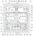 本发明所述的一种快速换刀的内螺纹孔等距加工装置,包括支座11,所述支座11内设有内腔51,所述内腔51左右壁分别连通有限位腔12,所述限位腔12内设有上下滑动的工作台15,所述工作台15上端与所述限位腔12上壁之间连接有限位弹簧33,所述工作台15内设有开口向上的工作台腔14,所述工作台腔14前壁转动连接有滚动齿轮轴31,所述滚动齿轮轴31上固连有滚动齿轮32,所述工作台腔14前后壁设有左右滑动的滑动齿条16,所述滑动齿条16下端啮合于所述滚动齿轮32上端,所述滑动齿条16上端固设有工件夹持台13,所述工件夹持台13用于夹持加工工件,所述内腔51上侧左右壁分别固连哟固定板35,所述固定板35内设有开口向上的滑块槽60,所述内腔51左右壁分别转动连接传动螺纹轴36,所述传动螺纹轴36上设有左右滑动的滑块59,所述滑块59下端滑动设于所述滑块槽60内,所述内腔51上壁转动连接有传动轴47,所述传动轴47内花键连接有钻头轴58,所述钻头轴58下端固连有钻头57,所述滑块59靠近所述传动轴47的一端固连有连接板53,所述内腔51后壁连通有连接弹簧腔64,所述连接弹簧腔64内设有两个左右滑动的限位杆63,两个所述限位杆63的前端分别对应固连于两个所述连接板53的后端,所述限位杆63远离所述传动轴47的一端与所述连接弹簧腔64之间连接有连接弹簧62,所述连接板53靠近所述传动轴47的一端内转动连接有丝锥杆54,所述丝锥杆54下端固连有丝锥55,所述丝锥55位于两个所述丝锥55中间,所述钻头轴58上固连有定位杆56,所述内腔51前后壁分别连通有电磁弹簧83,后侧所述电磁弹簧83上壁内设有电源69,所述定位杆56前后端分别上下滑动设于所述电磁弹簧83内,且所述定位杆56前后侧上端与所述电磁弹簧83上壁之间连接有电磁弹簧腔82,所述电磁弹簧腔82与所述电源69之间电性连接,所述内腔51下壁固连有两个支撑杆23,所述支撑杆23上转动连接有两个联动杆22,所述联动杆22远离所述传动轴47的一端铰接有连接杆21,所述工作台15下端内设有两个开口向下的滑动槽17,所述连接杆21上端左右滑动设于所述滑动槽17内,所述内腔51下壁转动连接有两个转动螺纹轴27,两个所述转动螺纹轴27位于两个所述支撑杆23之间,所述联动杆22靠近所述传动轴47的一端内设有上下贯通的缓冲弹簧腔24,所述缓冲弹簧腔24左右壁分别固连有缓冲弹簧26,两个所述缓冲弹簧26之间固连有升降块25,所述升降块25上下滑动设于所述转动螺纹轴27上,所述内腔51下端固连有衔接管道18,所述衔接管道18内设有开口向上的衔接通道19,所述衔接通道19内设有上下滑动的衔接杆20,所述衔接杆20上端伸入到所述内腔51内,且所述衔接杆20上端固连于所述工作台15下端,所述衔接杆20起到定位作用,此时人工将需要加工的工件夹持在所述工件夹持台13上,同时所述转动螺纹轴27转动,所述升降块25向下滑动,进而带动所述联动杆22靠近所述传动轴47的一端向下转动,同时带动所述联动杆22远离所述传动轴47的一端向上转动,进而带动所述连接杆21向上运动,同时带动所述工作台15向上运动,进而带动所述工件夹持台13与所述加工工件运动到到加工初始位置,同时停止所述转动螺纹轴27转动,此时所述传动轴47转动,带动所述钻头轴58转动,进而带动所述钻头57转动,同时程序控制所述电源69通电,带动所述电磁弹簧腔82向下伸长,进而带动所述定位杆56向下滑动,同时带动所述钻头轴58与所述钻头57向下运动,进而所述钻头57对工件加工定位孔,定位孔加工完毕后,此时程序控制所述电源69断电,所述电磁弹簧腔82自身弹力作用下,带动所述定位杆56向上运动,进而带动钻头轴58与所述钻头57运动到上极限位置,同时所述传动螺纹轴36转动,两个所述滑块59沿所述滑块槽60向靠近所述传动轴47的一侧滑动,进而带动所述连接板53向靠近所述传动轴47的一侧运动,同时带动所述丝锥杆54与所述丝锥55向靠近所述传动轴47的一侧运动,进而带动两个左右侧的连接板53左右端相抵,且带动两个左右侧的丝锥杆54左右端相抵,同时所述丝锥杆54转动,带动所述丝锥55转动,进而开始加工内螺纹孔,同时所述转动螺纹轴27转动,间接带动所述工作台15与所述工件夹持台13向上匀速向上运动,进而带动工件匀速向上运动,进而控制所述丝锥55对工件加工内螺纹孔。