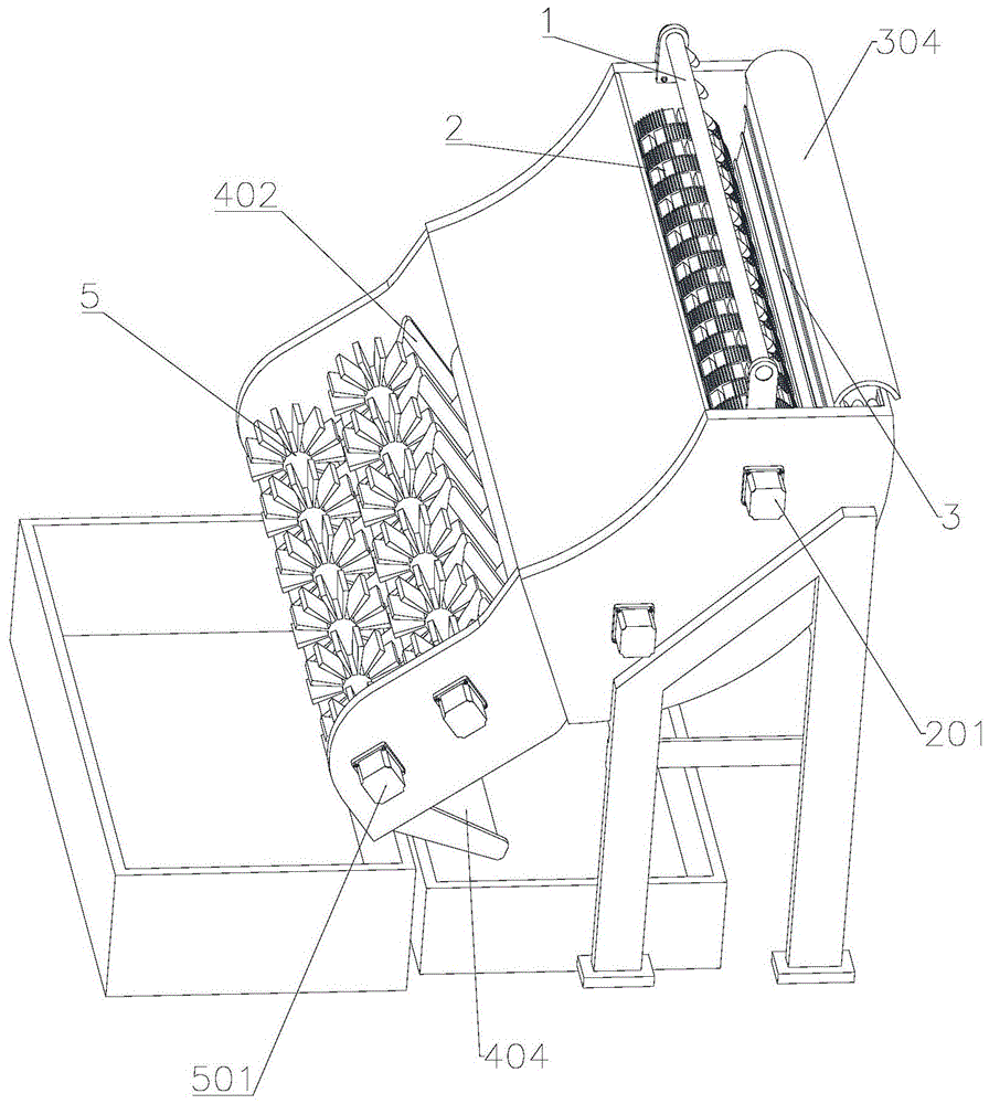 In the figure, 1, a spray pipe, 2, a scrubbing rolling shaft, 3, a speed reducing plate, 4, a draining plate, 5, a brush roller, 201, a scrubbing motor, 202, a scrubbing main shaft, 203, a fixed seat, 204, a scrubbing plate, 205, a sponge strip, 301, an adjusting spring, 302, a rack, 303, a ridge, 304, a semicircular tile, 401, a draining port, 402, a dividing column, 403, a mud blocking strip, 404, a water receiving plate, 501, a brush motor, 502, a brush main shaft, 503 and a brush wheel.