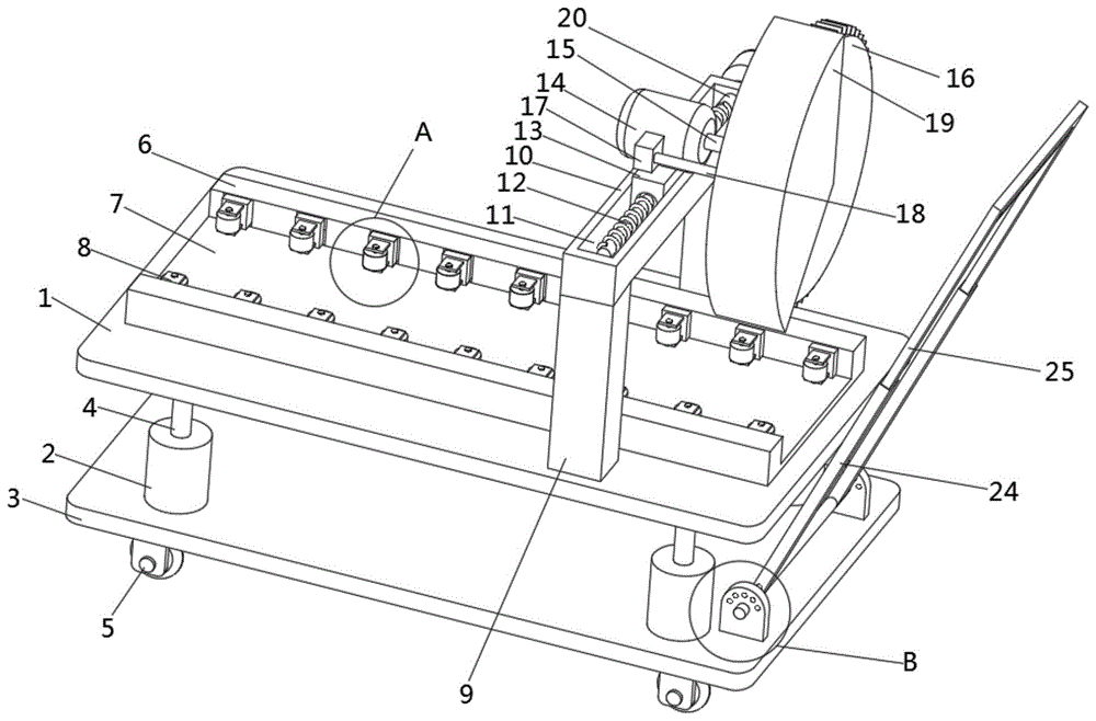 The invention discloses a steel plate grinding machine in the technical field of mechanical processing tools. There is a cross bar, a moving slot is opened on the upper end surface of the cross bar, a support plate is fixedly connected to the rear end surface of the cross bar, a second motor is fixedly connected to the end surface of the support plate, the output end of the second motor is rotatably connected with a second rotating shaft, and the front end of the second rotating shaft is connected The surface is coaxially connected with a screw, the screw is arranged in the moving groove, the outer end surface of the screw is connected with a moving block through a thread, the upper end surface of the moving block is fixedly connected with a first motor, and the output end of the first motor is rotatably connected with a first rotating shaft, the first rotating shaft The right end face is coaxially connected with a grinding wheel, and the present invention can complete the action of grinding the steel plate back and forth by setting the second motor, the second rotating shaft, the screw rod, the moving groove, the moving block, the first motor, the first rotating shaft and the grinding wheel. It can achieve the effect of grinding the surface of the steel plate completely.
