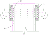 封堵块28、转盘26以及支撑柱25能够约束透气筒4底端水平移动,从而提高透气筒4的稳定性。操作人员能通过转动转盘26,使得封堵块28在透气筒4内竖向滑动,从而调节封堵块28顶端伸入至透气段的长度尺寸。冬季时,操作人员能够令封堵块28向上移动,从而封堵部分透气孔23,减少自透气筒4进入地下室的室内空气,减少地下室的室内热量的损失。
