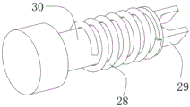 As shown in figures 1-7, a drug delivery device convenient for nursing in medical oncology comprises a support rod 1 and a drug bottle seat 4, wherein the lower surface of the support rod 1 is fixedly connected with a base 2, the top side surface of the support rod 1 is fixedly connected with a fixed shaft 5, the drug bottle seat 4 is rotatably connected with the outer surface of the fixed shaft 5, the bottom end of the fixed shaft 5 is fixedly connected with a fixed seat 7, the outer surface of the drug bottle seat 4 is provided with a fixed groove 6, the inner top of the fixed groove 6 is movably inserted with a pressing block 10, the top end of the pressing block 10 is fixedly connected with an L-shaped rod 17, the outer surface of the top end of the fixed shaft 5 is in threaded connection with a rotating disc 11, one end of the L-shaped rod 17, far away from the pressing block 10, is slidably connected with the inner side surface of the rotating disc 11, the inner bottom of the fixed groove 6 is provided with, a first spring 28 is movably sleeved on the outer surface of the movable rod 30, a first gear 8 is fixedly connected to the lower surface of the medicine bottle holder 4, the first gear 8 is movably clamped inside the fixed seat 7, a thread clamping tube 9 is movably clamped on the lower surface of the fixed seat 7, a mounting groove 19 is formed in the outer surface of the thread clamping tube 9, a rotating plate 20 is connected to the outer surface of the upper end of the thread clamping tube 9 in a threaded manner, a pawl 26 is movably clamped on the outer surface of the rotating plate 20, a second gear 23 is movably sleeved on the outer surface of the rotating plate 20, a clamping groove 27 is formed in the inner ring of the second gear 23, the pawl 26 is movably clamped with the clamping groove 27, a first baffle 21 is fixedly connected to the top end of the thread clamping tube 9, a second spring 22 is movably sleeved on the outer surface of the thread clamping tube 9 and positioned between the rotating plate 20 and the first baffle 21, the rotating plate 20 is rotatably connected inside, the upper surface of the fixed seat 7 is provided with a circular groove 13, the bottom end of the fixed shaft 5 is fixedly connected to the inner bottom of the circular groove 13, the first gear 8 is movably clamped inside the circular groove 13, the upper surface of the fixed seat 7 and the side surface of the circular groove 13 are provided with a communicating groove 14, the distance from the communicating groove 14 to the fixed shaft 5 is equal to the distance from the limiting groove 12 to the fixed shaft 5, the top end of the threaded clamping pipe 9 is opposite to the lower surface of the communicating groove 14, two sides of the outer surface of the rotating plate 20 are symmetrically provided with rotating grooves 25, the pawl 26 is rotatably connected inside the rotating grooves 25, the lower surface of the pawl 26 is movably clamped with a torsion spring, the outer surface of the bottom end of the threaded clamping pipe 9 is fixedly connected with a second baffle plate 24;