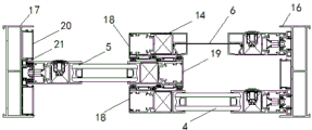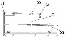 Furthermore, a lower cushion block 24 is connected and arranged below the outer window sash in the embodiment, the insertion height of the lower cushion block 24 is consistent with the height difference between the second sliding plane and the third sliding plane, so that the frame edge end surface of the outer window sash keeps parallel and consistent with the inner window sash in the indoor viewing effect, in addition, the hook rabbet of the outer window sash 4, the hook rabbet of the inner window sash 5 and the hook rabbet of the screen window sash 6 are respectively and correspondingly provided with a single hook rabbet hook 18 and a double hook rabbet hook 19, wherein the double hook rabbet hook 19 is arranged at the end part of the hook rabbet 25 of the inner window sash 5 and respectively forms matching and hooking with the single hook rabbet hooks 18 of the outer window sash 4 and the screen window sash 6 to form limiting. In addition, the left edge seal 17 and the right edge seal 16 are provided with corresponding hooked rabbet auxiliary frames 20 and smooth rabbet locking grooves 21 corresponding to the window sashes, and the smooth rabbet locking grooves 21 can be directly matched and locked with locking pieces in the smooth rabbet of the window sashes when in use.