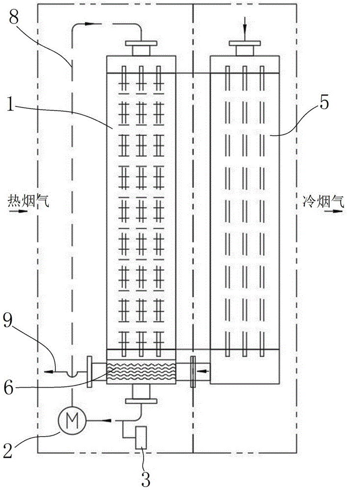 2. The anti-corrosion and anti-wind channel blockage method comprises the steps that firstly, for a first heat exchanger 1, the temperature of a first heat exchange medium 8 in the first heat exchanger is adjusted to be higher than the dew point temperature of water vapor condensation in tail gas, so that the water vapor can not be condensed at the first heat exchanger 1, and common anti-corrosion schemes such as hot galvanizing or electroplating are adopted on the outer surface of the first heat exchanger 1, so that the anti-corrosion purpose of the first heat exchanger 1 is realized, the finned tube heat exchanger made of common carbon steel can be selected safely, and no condensation can occur, so that an acid solution can not be formed, the surface of the first heat exchanger 1 can not rust, and the problem of preventing the flue blockage is solved; secondly, for the second heat exchanger 5, because the second heat exchanger 5 is in a low-temperature region, and the temperature of the second heat exchange medium 9 in the second heat exchanger is low, the second heat exchanger 5 is a core region for condensation heat exchange, and a large amount of condensed water is inevitably generated on the outer surface of the second heat exchanger 5, so that a large amount of dilute nitric acid solution can be formed, therefore, the second heat exchanger 5 is a core region which is corroded, and the corrosion resistance of the second heat exchanger is good, and the second heat exchanger 5 is integrally made of corrosion-resistant materials such as stainless steel and the like to play a main corrosion resistance role; in addition, in order to prevent the acid solution from being accumulated on the surface of the second heat exchanger 5, a smooth-surface non-groove light pipe heat exchanger is selected, so that the acid solution cannot be accumulated on the surface of the heat exchanger for a long time; furthermore, in order to prevent the acidic solution from bonding to the surface of the second heat exchanger 5 after being combined with the dust, the spraying pipe 4 is arranged, and the water outlet 43 is also arranged at the lower part of the spraying pipe, so that the outer surface of the second heat exchanger 5 is regularly washed, the dust and the acidic solution are washed down and discharged from the water outlet 43, and the corrosion of the outer surface of the second heat exchanger 5 and the inner wall surface of the flue is avoided; the design of the above anticorrosion measures has the advantages of excellent anticorrosion and flue blockage prevention on the premise of low cost, simple structure and high heat exchange efficiency; the corrosion of the waste heat recovery system is mainly electrochemical corrosion, the contents of the discharged gases of various boilers and gas turbines are different, the environmental pressures are different, the dew points (condensation-generating temperatures) are different, when the temperature of a certain point of the heat exchange device is lower than the condensation temperature, dew condensation can be generated, so that the heat exchanger is corroded, all the temperatures of the heat exchanger are higher than the dew point temperature by controlling the temperature of a cold-side medium of the heat recovery device, and the heat recovery quantity of a common heat exchanger can be reduced to the maximum extent by using common materials.