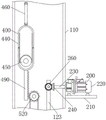 The left end of the feeding machine 110 is provided with a transmission mechanism 500, the transmission mechanism 500 comprises a fifth connecting rod 510, the inner wall bearing of the left end of the feeding machine 110 is connected with the fifth connecting rod 510, the right end of the fifth connecting rod 510 is fixedly connected with a second gear 520, the outer wall of the second gear 520 is meshed with a rack 490, the outer wall of the fifth connecting rod 510 is fixedly connected with a third belt pulley 530, the outer wall of the third belt pulley 530 is wound with a second belt 540, the inner wall bearing of the feeding machine 110 is connected with a sixth connecting rod 550, the outer wall of the sixth connecting rod 550 is fixedly connected with a fourth belt pulley 560, the other end of the second belt 540 is wound on the outer wall of the fourth belt pulley 560, the outer wall of the sixth connecting rod 550 is fixedly connected with.