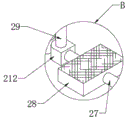 The adjacent sides of the tops of the two top crossbars 26 are respectively welded with a socket 210 and a fixed seat 211, the socket 210 is internally provided with a slot 213, the fixed seat 211 is internally provided with a movable groove 217, the inner cavity of the movable groove 217 is connected with a sliding block 215 in a sliding way, one side of the sliding block 215 far away from the socket 210 is welded with a movable post 216, one side of the socket 210 near the socket 210 is welded with an insertion post 214, the surface of the movable post 216 is sleeved with a spring 218, one end of the spring 218 near the sliding block 215 is welded with the sliding block 215, one end of the spring 218 far away from the sliding block 215 is welded with the inner wall of the movable groove 217, one end of the movable post 216 far away from the sliding block 215 penetrates through the movable groove 217 and is welded with a stop block 219, one side of the stop block 219 far away from the movable groove 217 is welded with, the situation that the two top cross rods 26 rotate excessively is avoided, so that the purpose of locking the two top cross rods 26 is achieved, and the opening and closing door formed by the top cross rods 26, the bottom cross rods 27 and the vertical rods 29 can be locked.