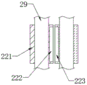 Two bottom horizontal poles 27 are kept away from rotating cover 25 one end welding and are had even piece 212, two top of even piece 212 all welds montant 29, the top of montant 29 welds in the bottom of top horizontal pole 26, fixed cover 221 has all been welded on the surface of two montants 29, two adjacent one sides of fixed cover 221 are inlayed respectively and are equipped with first magnet 222 and second magnet 223, first magnet 222 is the N utmost point towards the magnetic pole of second magnet 223 one side, second magnet 223 is the S utmost point towards the magnetic pole of first magnet 222 one side, through adopting above-mentioned technical scheme, through the inter attraction of first magnet 222 and second magnet 223, can make things convenient for two montants 29 to be close to each other, and then the convenience when having improved two montants 29 and opening.
