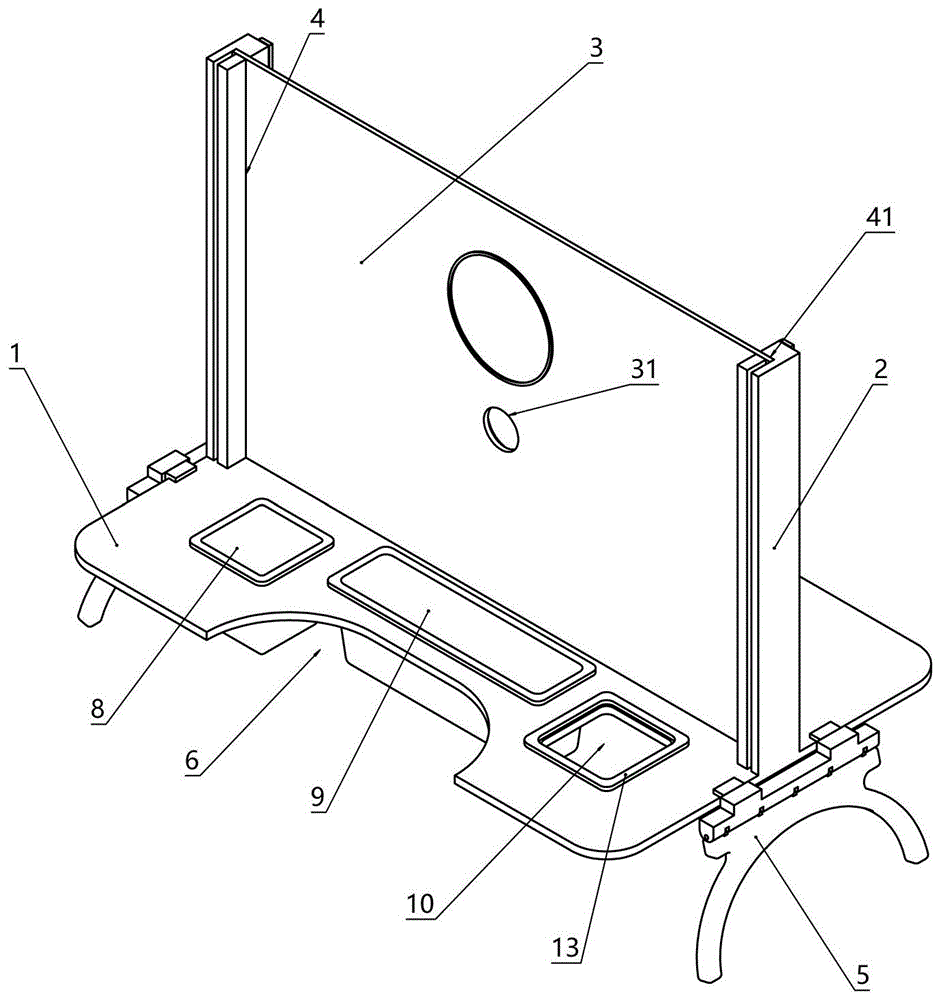As shown in fig. 1-4, three article holding grooves, namely an article holding groove 8, an article holding groove 8 and an article holding groove 10, are further arranged on one side of the collecting area 6, and are arranged along the length direction of the working table, wherein the length of the article holding groove 9 is greater than that of the article holding groove 8. As shown in fig. 1, a storage case 11 having a shape adapted to the storage compartment 8 is placed in the storage compartment 9, and a storage case 12 having a shape adapted to the storage compartment is placed in the storage compartment 9. Wherein, receiver 11 is used for holding the pharynx swab sample of collection, and is used for holding medical supplies such as antiseptic solution, cotton swab, gloves in the receiver 12. The length of putting thing groove 9 sets up to be greater than the aim at who puts thing groove 8's length, and medical personnel need use the medical supplies project more, sets up like this and conveniently arranges medical supplies, makes things convenient for medical personnel to select to use. In addition, a ring of annular grooves are further formed around the storage tank 10, and a pressing cover 13 matched with the annular grooves in shape is used for installing a flexible bag, wherein the flexible bag can be a plastic bag or a paper bag and the like, and is mainly used for containing medical waste in the throat swab collection process to prevent environmental pollution. The gland 13 preferably has a T-shaped cross-section for engaging with the annular groove and further a cover plate for covering the opening of the flexible bag is provided on the gland to further prevent the medical waste from contaminating the environment. In addition, as shown in fig. 3, a storage groove 14 is further formed on one side of the collected area 7, and similarly, a ring-shaped groove is further formed around the storage groove 14, and a pressing cover matched with the shape of the ring-shaped groove is used for installing a flexible bag, which can be a plastic bag or a paper bag and the like, and the flexible bag is mainly used for facilitating the collected object to tear off a protective film used by the collected object conveniently after the sample collection is completed and placed in the flexible bag.