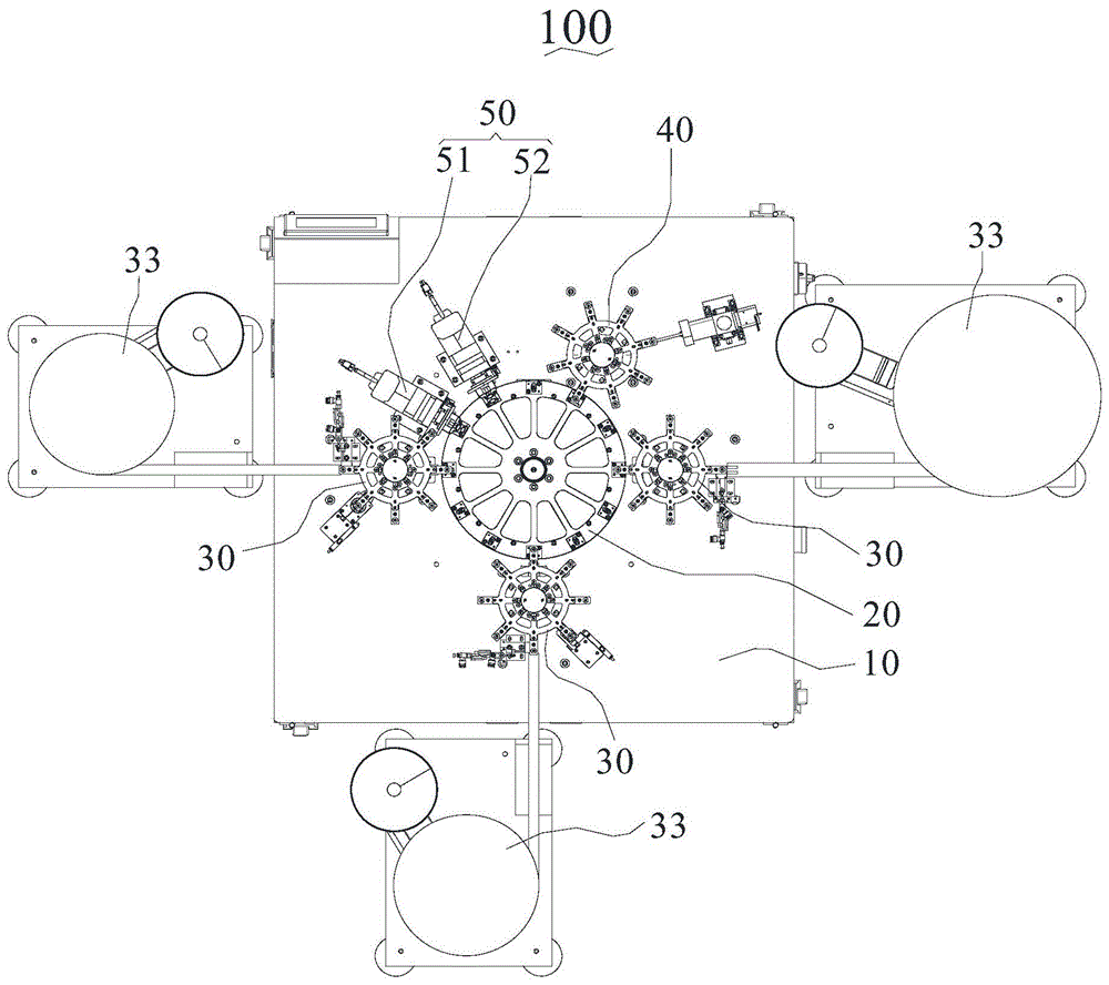 As shown in fig. 1, the automatic loading and unloading processing apparatus 100 provided by the present invention includes a frame 10 and a processing table disposed on the frame 10, wherein the processing table is a rotating table 20 disposed at the center of the frame 10 in this embodiment. The transfer of the product workpiece from one processing station to another by the processing apparatus provided by the present invention is accomplished by a rotating table 20 at the center of the frame 10. The processing items or processing procedures that can be performed by the product workpiece on the processing apparatus 100 provided by the present invention are determined by other components disposed on the frame 10 around the rotary table 20. The circumference outside of the rotary worktable 20 on the frame 10 is provided with a plurality of processing stations, and each processing station can be correspondingly provided with different processing parts, thereby realizing various different processes of press fitting, stacking, sticking, labeling, marking, detecting and the like for the transferred products on the rotary worktable 20. The number of the processing stations on the rotary worktable 20 is related to the requirement of product processing, and at least comprises a loading position of a workpiece, a processing position of the workpiece and a discharging position of the product, and the processing stations on three bases, so that at least one processing procedure is finished on the rotary worktable 20. The more processing stations are arranged on the rotary worktable 20, the more complex the processing which can be realized correspondingly, the more workpieces can be loaded, and the more complex and orderly the processing technology can be realized. The processing equipment 100 capable of automatically feeding and discharging provided by the invention can maximally reduce the area occupied by the processing equipment 100, the number of processing parts is increased as much as possible on the rack 10 in unit area, the structure is compact, and the rotary worktable 20 can shorten the moving distance between adjacent processes, thereby reducing the material moving time in the processing process and improving the production efficiency and the productivity of the processing equipment 100.
