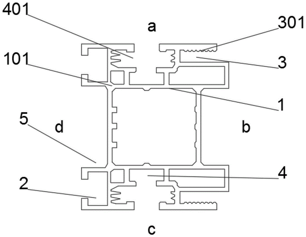 In the embodiment, the profile main body 1 is made of an aluminum alloy material, the surface of the profile main body 1 is subjected to anti-oxidation treatment, the reinforcing ribs 101 are arranged in the profile main body 1, the reinforcing ribs 101 are arranged in three groups, the reinforcing ribs 101 are arranged at equal intervals, and the reinforcing ribs 101 are made of hard alloy, so that the strength and the corrosion resistance of the profile are improved, and the service life of the profile is prolonged; two groups of connecting clamping grooves 2 are arranged in quantity, the two groups of connecting clamping grooves 2 are arranged on the same surface and symmetrically arranged on two sides of the groove 5, and the connecting clamping grooves 2 are arranged to facilitate installation of other reinforcing members or supporting members, so that the installation portability of the section bar is improved; two clamping grooves 3 are arranged in number and are located on the same surface, two groups of clamping grooves 3 are symmetrically arranged on two sides of the groove 5, the depth of each clamping groove 3 is larger than that of the groove 5, a clamping tooth 301 is arranged on one side, far away from the groove 5, in each clamping groove 3, a plurality of clamping teeth 301 are arranged, the clamping teeth 301 are arranged in an equidistant and linear mode, the two groups of clamping grooves 3 are conveniently used for clamping decorative strips, the clamping teeth 301 are used for further fixing the decorative strips, sliding is prevented, and stability is improved; two groups of connecting positioning grooves 4 are formed in quantity, the two groups of connecting positioning grooves 4 are distributed on the surface a and the surface c opposite to the surface a, and the connecting positioning grooves 4 are arranged to facilitate the positioning connection of the section in the vertical direction and facilitate the case and disassembly of the section main body 1; the two groups of grooves 5 are arranged in number, connecting holes 6 and through holes 7 are formed in the inner walls of the two groups of grooves 5, the connecting holes 6 and the through holes 7 are arranged on the same central line, the connecting holes 6 and the through holes 7 are arranged at equal intervals alternately, so that the connecting holes 6 are arranged to facilitate installation of heads and nuts of bolts for connecting the two sectional materials, and the electric wires can pass through the through holes 7; connect 4 one sides of constant head tank to be provided with T type bolt groove 401, T type bolt groove 401 both sides are provided with the arch, the size looks adaptation of T type bolt groove 401 and T type bolt, T type bolt groove 401 is through T type bolt and other section bar fixed connection, connect constant head tank 4 convenience and be connected with other section bars, and effectively prevent that T type bolt is not hard up through the raising that sets up in T type bolt groove 401, improve the stability of connecting.