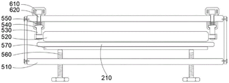 结合图7所示,在上述实施例中,压力传感器610、调节栓560和轮架530均至少设有两组,用于均衡对刮墨刀210的调节,由于刮墨刀210为板式结构,所以需要在刮墨刀210上至少设置两组机构,比如两组以上的调节栓560可以使得连接头570平稳整齐的向上挤压刮墨刀210,使得刮墨刀210的调节效果更好,两组压力传感器610可以分别对刮墨刀210的两侧进行受压调节,保证了刮墨刀210两侧形变的均衡,便于操控调整,使得调整后的刮墨刀210更加精准,刮墨效果更好,从而提高了装置的可行性。