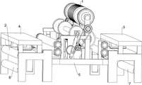 the double-group grinding unit (102) comprises a first rotating shaft (10201), a turning support (10202), a first grinding roller (10203), a fifth straight gear (10204), a second grinding roller (10205), a second rotating shaft (10206), a third grinding roller (10207), a sixth straight gear (10208), a roller (10209), a third transmission wheel (10210), a third rotating shaft (10211), a fourth transmission wheel (10212), a seventh straight gear (10213), a fourth rotating shaft (10214), a transmission rod (10215), a rotary disc (10216), a gear ring (10217), a slider support (10218), an electric rotating shaft (10219), an eighth straight gear (10220) and a ninth straight gear (10221); the first rotating shaft (10201) is rotatably connected with the fixed frame (5); an output shaft of the main motor (9) is fixedly connected with the first rotating shaft (10201); the first rotating shaft (10201) is fixedly connected with the overturning bracket (10202) and the first rotating shaft (10201); the first grinding roller (10203) is rotatably connected with one side below the overturning bracket (10202) through a rotating shaft; the second grinding roller (10205) is rotatably connected with the other side below the overturning bracket (10202) through a rotating shaft; two groups of fifth straight gears (10204) are respectively and fixedly connected with one ends of the first grinding roller (10203) and the second grinding roller (10205); a second rotating shaft (10206) is rotatably connected with the overturning bracket (10202) above the second grinding roller (10205); the third grinding roller (10207) and the sixth straight gear (10208) are fixedly connected with a second rotating shaft (10206); two groups of rollers (10209) are fixedly connected with a second rotating shaft (10206) at two sides of a third grinding roller (10207); on one side of the turning bracket (10202), a third driving wheel (10210) is fixedly connected with a first rotating shaft (10201); a third rotating shaft (10211) is rotatably connected with the fixed frame (5) below the third driving wheel (10210); the fourth transmission wheel (10212) and the seventh straight gear (10213) are fixedly connected with a third rotating shaft (10211); the third transmission wheel (10210) is in transmission connection with the fourth transmission wheel (10212); a fourth rotating shaft (10214) is rotatably connected with the fixed frame (5) below the third driving wheel (10210); the transmission rod (10215) is fixedly connected with the fourth rotating shaft (10214); above the fourth rotating shaft (10214), the rotating disc (10216) is rotationally connected with the fixed frame (5) through the rotating shaft; the gear ring (10217) is fixedly connected with the turntable (10216); the gear ring (10217) is meshed with a seventh spur gear (10213); the rotary disc (10216) is in transmission connection with the transmission rod (10215) through a rotating shaft; above the turntable (10216), the slider bracket (10218) is connected with the fixed frame (5) in a sliding way; the transmission rod (10215) is in transmission connection with the slider bracket (10218) through a rotating shaft; two groups of third transmission wheels (10210), third rotating shafts (10211), fourth transmission wheels (10212), seventh straight gears (10213), fourth rotating shafts (10214), transmission rods (10215), rotating discs (10216), toothed rings (10217) and sliding block supports (10218) are arranged on two sides of the fixed frame (5); two sides of the electric rotating shaft (10219) are respectively connected with a corresponding group of slide block brackets (10218) in a rotating way; two ends of the electric rotating shaft (10219) are respectively in transmission connection with a corresponding group of transmission rods (10215); the two groups of eighth straight gears (10220) are fixedly connected with an electric rotating shaft (10219); each group of eighth spur gears (10220) is meshed with a corresponding group of fifth spur gears (10204); on the eighth spur gear (10220) side, a ninth spur gear (10221) is fixedly connected to the electric rotating shaft (10219).