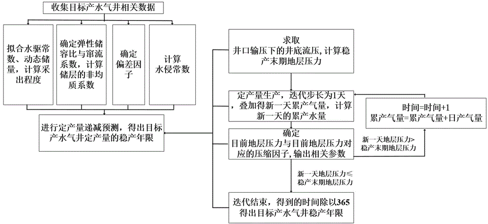S700, performing decrement prediction on the fixed yield of the target water producing gas well to obtain the stable yield period of the fixed yield of the target water producing gas well, and the specific steps are as follows: firstly, pressing the original stratum by Hagedom-Brown methodp iPressure transmission at well mouthp tFormation temperatureT iWell head temperaturetWell bore producing zone mid-depthhRadius of wellborer wDaily gas productionq gDaily water yieldq wRelative density of gas sampleγ gNitrogen gas mole fractiony N2Carbon dioxide mole fractiony CO2Hydrogen sulfide mole fractiony H2SRelative density of water sampleγ wAnd sodium chloride mole fractiony NaClCarrying in and obtaining the bottom hole flow pressure under the well head pressurep wfminBottom hole flowing pressure at the final stage of stable productionp wfmin(ii) a Secondly, calculating the bottom hole flowing pressure at the final stage of stable production according to a one-point method formulap wfminLower steady end formation pressurep min(ii) a Thirdly, the current accumulated gas yield of the target water producing gas well is divided by the dynamic reserve of the target water producing gas well to obtain the production degree of the reserveRCombining the water-sealed gas substance balance formula with the D-A-K method to obtain the current formation pressurepCompression factor corresponding to current formation pressurez(ii) a Fourth, the target water producing gas wellq gQuantitative production, taking 1 day as iteration step length, and overlappingG pObtaining the accumulated gas yield of the new day, substituting the obtained gas yield into a type A water drive formula of the target water-producing gas well to calculate the accumulated water yield of the new day, and combining a water-seal gas substance balance formula and a D-A-K method to obtain the formation pressure of the new day until the formation pressure of the new day is less than or equal to the formation pressure at the final stable production stagep minFinishing iteration, substituting a one-point method formula to reversely calculate the bottom hole flowing pressure, drawing a change curve of the bottom hole flowing pressure along with time, and obtaining a fixed yield decreasing prediction curve of the target water producing gas well; and fifthly, obtaining the stable production age of the target water producing gas well according to the time when the iteration is finished and the 365 days.
