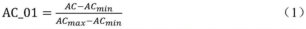 (1)声波测井曲线归一化处理,得到AC_01曲线:利用声波测井曲线数据,按公式(1)计算声波时差归一化曲线AC_01。(1) The sonic logging curve is normalized to obtain the AC_01 curve: using the sonic logging curve data, the sonic time difference normalized curve AC_01 is calculated according to formula (1).