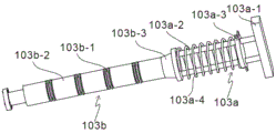 Furthermore, a sliding groove 101a is transversely formed in one side of the winding roller 101, which is close to the first driving motor 102, and the outer edge of the winding roller 101 is arranged in the tensioning groove 101 b. The control mechanism 103a comprises a sliding rod 103a-1 arranged in the sliding groove 101a and a pull rod 103a-2 connected with the sliding rod 103a-1, a limiting block 103a-3 connected with the cavity of the winding roller 101 is arranged on the outer side of the pull rod 103a-2, and the limiting block 103a-3 is connected with a spring 103 a-4. The outer side of the wind-up roll 101 on one side of the sliding rod 103a-1 close to the limiting block 103a-3 is sleeved with a pull ring 103a-5, and the pull ring 103a-5 is connected with a driving piece 103 a-6. The tensioning mechanism 103b comprises a plurality of tensioning sleeves 103b-2 which are mutually connected through rubber rings 103b-1, and a tensioning seat 103b-3 which is arranged at the tail end of the tensioning mechanism 103b and connected with the pull rod 103 a-2.