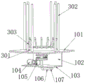 By the technical scheme, the test tube fixing assembly 3 is designed, the test tube cleaning column 303 is fixedly installed in the test tube fixing assembly, a test tube can be sleeved on the test tube cleaning column 303, the pressure generated during glass product washing can be well softened by the aid of the bending spring 303b during cleaning, the lower clamping groove 303g is matched with the clamping elastic plate 303h, and the test tube cleaning column 303 can be conveniently taken down integrally by means of plugging and unplugging to clean the whole device; wherein drive gear 105 fixed through the rotating electrical machines 104 output end of lower extreme meshes the water diversion disc 305 rotation of upper end for one number of fluted discs 109, the washing liquid after will supercharging through the booster valve 107 of lower extreme passes through limbers 304, spout water diversion hole 306, the even washing liquid that sprays to the test tube of its rotatory cooperation test tube column fixed turntable 301, mesh fluted disc 109 and fluted disc 111 for two numbers of from top to bottom through turning to tooth 110, turn to rotary power, make test tube column fixed turntable 301 opposite with water diversion disc 305's direction of rotation, make the number of times that water diversion hole 306 and test tube washing column 303 are crisscross become frequent, can make the abluent more clean of test tube.