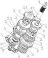 FIG. 3 is a schematic structural view of the novel automatic shifting transmission assembly (with the high and low range sliding sleeves and one of the moving sleeve portions removed).