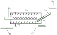 dryer 5 includes dewatering cylinder 31, third support 32, intake pipe 33, second spout 34, third support 32 passes through roller support dewatering cylinder 31, there is the motor through the link wheel mechanism hookup on dewatering cylinder 31, dewatering cylinder 31 inner wall is equipped with the stator, intake pipe 33 stretches into in dewatering cylinder 31 from dewatering cylinder 31 one end, the chute stretches into in dewatering cylinder 31 from the downward sloping of dewatering cylinder 31 other end, the part that intake pipe 33 stretched into dewatering cylinder 31 distributes and has a plurality of ventholes, dewatering cylinder 31 is close to intake pipe 33 one end edge distribution and has a plurality of openings.