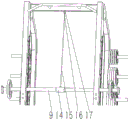 所述第一保护装置12包括套管14、连接绳15、紧固环16、连接螺栓17,所述紧固环16通过所述连接螺栓17可拆卸的连接在所述顶部连接板4底面中心处,所述套管14套接在所述杠铃杆9中心处,所述套管14外侧与所述连接绳15一端连接,所述连接绳15的另一端缠绕连接在所述紧固环16上,所述连接绳15为弹力绳,辅助训练,避免训练人员在训练过程中运动损伤。所述第一保护装置12,通过所述连接绳15来辅助训练人员训练,给训练人员提供助力,当推至最低点时,助力最大,一方面可以辅助训练人员训练,另一方面避免了训练人员无人辅助导致受伤。