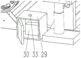 所述第三保护装置25包括安装板26、电动推杆27、顶起架28,两个所述底板1外侧均设置有所述安装板26,两个所述安装板26顶面中心处安装有所述电动推杆27,所述电动推杆27优选北京天誉创新科技有限公司的多级电动推杆。所述电动推杆27外接电源供电使用,所述电动推杆27的输出端设置有所述顶起架28,所述顶起架28为U形结构,所述顶起架28的U形底面为波浪形,波浪形的凹槽与所述杠铃杆9外形相适配,避免顶起过程中所述杠铃杆9晃动。所述底板1外侧设置有电气箱29,所述电气箱29内安装有控制器30,所述控制器30优选军创自动化科技有限公司的标准型PLC,型号为JS-68T-D,满足本发明的控制需要。所述支撑板3内侧下部安装有顶起按钮31,所述顶起按钮31外侧设置有击打块32,增加所述顶起按钮31的接触面积,当出现紧急情况时,便于训练人员通过拍打、锤击等方式,启动所述顶起按钮31。所述电气箱29顶面安装有回落按钮33,所述控制器30与所述顶起按钮31、所述回落按钮33、所述电动推杆27之间均通过电路连接。当所述杠铃杆9坠落后,训练人员按下所述顶起按钮31,所述控制器30接受信号,控制所述电动推杆27升起,通过所述顶起架28来将所述杠铃杆9顶起,使训练人员脱困。脱困后,根据实际情况,按下所述回落按钮33,所述电动推杆27回落。