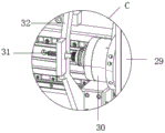 在本实施例中,二级主轴箱29侧壁上通过固定螺丝固定安装有卧式主轴30,卧式主轴30顶端固定连接有二级主轴打刀缸,卧式主轴30的输出端固定连接有二级刀具31,二级刀具31外部设有卧式辅助钻套32,卧式辅助钻套32通过固定螺丝固定安装在横梁26外表面,卧式辅助钻套32顶端设有卧式钻套。
