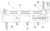 2、夹具输送机构;21、驱动导轨;22、滑块;23、滑轨;24、第一推动驱动件;25、第二推动驱动件;26、第三推动驱动件;27、定位驱动件;