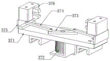 Preferably, a tensioning assembly 37 is further arranged on the sliding table of the screw rod sliding table 33, the tensioning assembly 37 includes a bearing seat 371, a rotating motor 372, a rotating frame 373, two moving frames 374, two moving blocks 375 and two clamping jaws 376, the bearing seat 371 is arranged on the sliding table of the screw rod sliding table 33 and is in sliding fit with the conveying seat 31, the rotating motor 372 is arranged at the bottom of the bearing seat 371 and is in rotating fit with the bearing seat 371, the rotating frame 373 is disposed on the main shaft of the rotating motor 372 and is in transmission fit with the main shaft of the rotating motor 372, the rotating frame 373 is in rotating fit with the bearing seat 371, the two moving frames 374 are respectively arranged at two ends of the rotating frame 373, the two moving blocks 375 are symmetrically arranged on the bearing seat 371 and are in sliding fit with the bearing seat 371, the two moving blocks 375 are respectively connected with the two moving frames 374, and the two clamping jaws 376 are respectively arranged at the tops of the two moving blocks 375; when the fabrics to placing on the board 32 remove the transport, press from both sides tightly the both sides of fabrics through two clamping jaws 376, rotating electrical machines 372 drives swivel mount 373 and makes two removal frame 374 remove, two removal frame 374 drive two movable blocks 375 and bear the seat 371 on relative movement, two movable blocks 375 drive two clamping jaws 376 and outwards drag the fabrics both sides, fold and the phenomenon of part folding can not appear in the surface that makes the fabrics, it removes to bear seat 371 to drive by lead screw slip table 33 again, will stimulate the fabrics on placing board 32 through two clamping jaws 376, the frictional force of pinch roller 363 makes the surfacing of fabrics under the cooperation, when making printing and dyeing equipment 4 print and dye the fabrics, can not influence the printing and dyeing effect because of the fold on fabrics surface.