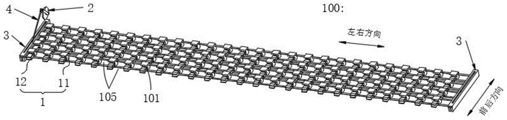 Referring to fig. 1, further, a connecting rod assembly 4 is further included, and the driving assembly 2 is preferably a rotating motor, and an output end of the rotating motor is connected to the connecting portion 321 of the left slider 32 through the connecting rod assembly 4.