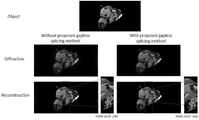 在本发明的实例中,物面分辨率为512×512,波长λ、中心角、采样间距和衍射距离分别为635nm、5°、29um、和172.8mm。本发明的两个片段柱面全息图拼接的有无拼缝对比结果如图3所示,三个片段柱面全息图拼接的有无拼缝对比结果如图4所示。结果表明,相比于直接拼接片段柱面全息图方法,本发明生成的片段柱面全息图具有较大的视场角,且重建图像中没有拼缝,提升了柱面全息显示的重建质量。In the example of the present invention, the resolution of the object plane is 512×512, and the wavelength λ, the central angle, the sampling spacing and the diffraction distance are 635 nm, 5°, 29 um, and 172.8 mm, respectively. Fig. 3 shows the comparison result of the present invention for splicing two segmented cylindrical holograms with or without stitching, and Fig. 4 shows the comparison result of splicing three segmented cylindrical holograms with or without stitching. The results show that, compared with the method of directly splicing segmented cylindrical holograms, the segmented cylindrical holograms generated by the present invention have a larger field of view, and there are no seams in the reconstructed images, which improves the reconstruction quality of cylindrical holographic display.