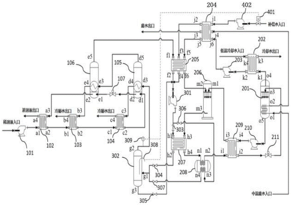 所述吸收式热泵循环系统包括:发生器201、冷凝器202、第二离心泵203、第三蒸发器 204、第四蒸发器205、吸收器206、第五蒸发器207、储能器208、第四预热器209和第三离心泵210;中温废水通过管路连接发生器201入口o1,发生器201出口o2通过管路接至第一蒸发器204的入口j4,第一蒸发器204的出口j3接排放管路,所述发生器201的蒸汽出口o4 通过管路连接冷凝器202入口k1,冷凝器202出口k2通过管路经第二离心泵203接至第一蒸发器204入口j6,第一蒸发器204的出口j5通过管路接至第二蒸发器205的入口f5,第二蒸发器205的出口f6通过管路连接至吸收器206的蒸汽入口m2;所述发生器201的浓溴化锂溶液出口o5通过管路经第三离心泵210连接至第四预热器209入口i4,第四预热器209出口i3通过管路连接至吸收器206的浓溶液入口m1;所述吸收器206的溴化锂稀溶液出口m3 通过管路连接至第三蒸发器207的入口h3,第三蒸发器207的出口h4通过管路连接至储能器208的蓄热管路入口n1,储能器208的出口n2通过管路接至第四预热器209的入口i1,第四预热器209的出口i2通过管路经第二减压阀211接至发生器201的溴化锂稀溶液入口o3;The absorption heat pump circulation system includes: a