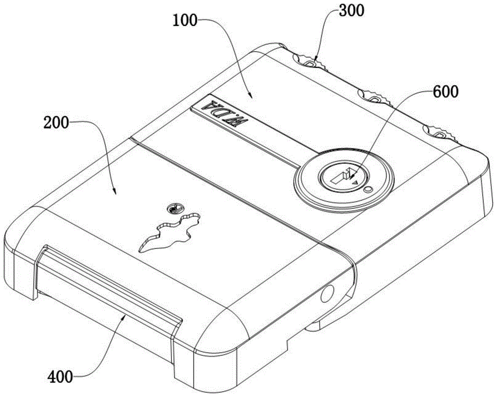The auxiliary body 200 is provided with a groove 210 for limiting reciprocating motion of the push button 400, the push button 400 is provided with a lock groove 410 matched with the lock hook 500, the auxiliary body 200 is clamped into the lock hook 500 along with the lock groove 410 to realize locking of the box body, the groove 210 can limit the reciprocating motion of the push button 400, a first spring 440 for preventing the push button 400 from being unlocked is arranged in the groove 210, the lock groove 410 is buckled with the lock hook 500 to realize locking of the box body, and the lock groove 410 is separated from the lock hook 500 to realize unlocking of the buckle lock.