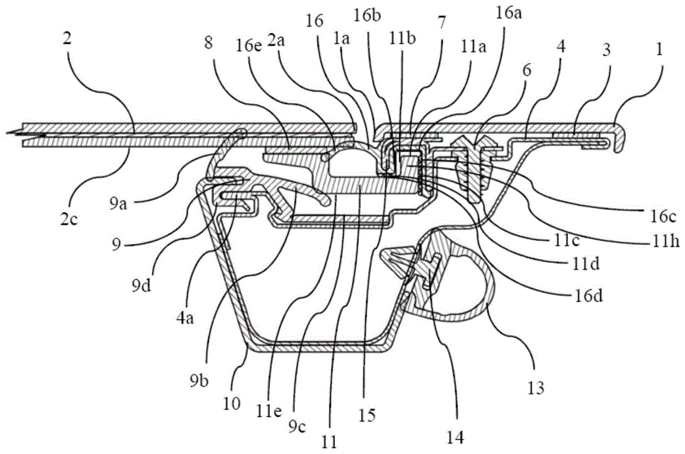 As shown in fig. 2, the door glass raising/lowering slider 11 is bonded to the door glass inner side face 2c in the vicinity of the door glass edge 2a by a glue 8, and the door glass raising/lowering rail 15 is fixed to the door sash 4 by a screw 6. The door glass lifting guide rail weather strip 16 is mounted on the door glass lifting guide rail 15, and the door glass lifting slider sliding portion 11h is fitted to the concave portion of the door glass lifting guide rail 15, so that the door glass 2 is lifted along the door glass lifting guide rail 15. And the fourth 16d of the sealing strip limiting surface of the door glass lifting guide rail is attached to the fourth 11d of the limiting surface of the door glass lifting slide block, so that the door glass 2 is limited along the inside and the outside of the door. The third door glass lifting guide rail sealing strip limiting surface 16c is attached to the third door glass lifting slide block limiting surface 11c, and the door glass 2 is limited in the front-back direction of the door. And a gap of 1-4 mm is formed between the second door glass lifting guide rail sealing strip limiting surface 16b and the second door glass lifting slide block limiting surface 11 b. A gap of 2-4 mm is formed between the first door glass lifting guide rail sealing strip limiting surface 16a and the first door glass lifting slide block limiting surface 11 a. The door glass run channel weather strip 9 is mounted on the door sash 4, and the door glass run channel weather strip holding portion 9d is held on the door sash flange 4 a. The glass run sealing strip lip 9a is in compression fit with the inner side surface 2c of the door glass, and plays a role in sealing and supporting the door glass 2. The glass run seal lip 9b is in compression fit with the door glass lifter slide 11. The bottom surface 9c of the glass guide groove sealing strip and the five 11e of the door glass lifting slide block surface are provided with 2-4 mm gaps, so that the collision between the door glass lifting slide block 11 and the glass guide groove sealing strip 9 is avoided. The first door glass lifter rail weather strip restriction surface 16a and the door glass inner side surface 2c are compression-fitted inside and outside the door in the vicinity of the door glass edge 2a to seal the gap between the door glass edge 2a and the door pillar trim edge 1 a. The gap between the edge 2a of the door glass and the edge 1a of the door upright post trim panel is 2-6 mm. The door sash inner decoration 10 is coated on the door sash 4, and is matched with the glass sealing strip 9 and the door first sealing strip 13 to play a decorative role. The door weather strip 13 is connected to the door sash 4 by a bead pin 14.