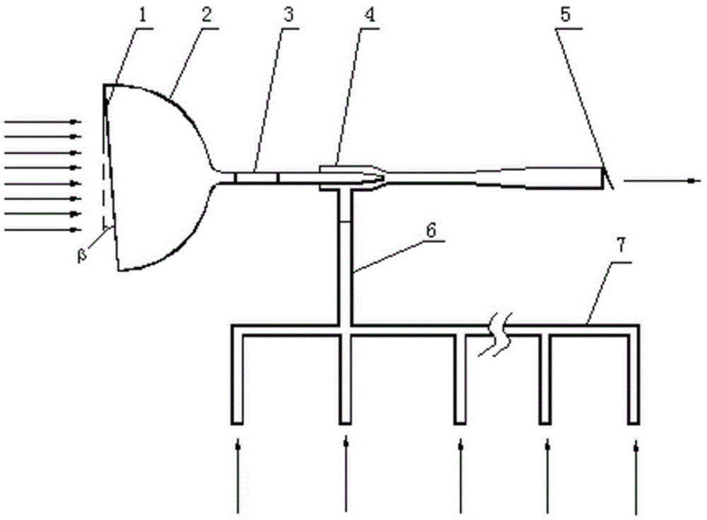 As shown in fig. 2, the air jet pump 4 is an important component, and sucks the air in the cabin by using high-speed wind introduced by the wind-collecting cover 2, and the air are mixed and then discharged to the atmosphere; an air inlet of the air jet pump 4 is connected with an outlet of the air collecting cover 2, an air suction inlet is connected with the inside of the cabin through an air suction connecting pipe 6, and an air outlet is communicated with the atmosphere. The ventilation pipe communicated with the cabin is connected with the suction inlet of the air jet pump 4, and a valve is arranged on the ventilation pipe to control the flow of the air in the suction chamber. When the high-speed boat runs, high-speed gas enters the air jet pump 4 from the air collecting hood 2 and is jetted out from the nozzle 4.4 to suck indoor air, and the indoor air are mixed in the mixing pipe and then are discharged into the atmosphere from the diffusion pipe 4.7. As the air in the cabin is sucked, the air in the cabin forms convection, and the cabin can be ventilated, so that the effect is good. And designing the air jet pump 4 according to the cabin ventilation requirement to determine the relative relationship between the main air flow and the jet induced air flow.