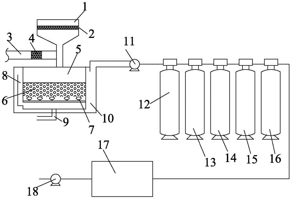 As shown in fig. 1, the embodiment provides an environmental protection device for building sewage treatment, which comprises a building sewage pipeline 3, a sedimentation sludge removal system, a filter group and a purification and sterilization tank 17 which are connected in sequence, wherein the sedimentation sludge removal system comprises a sludge removal chamber 5 and a sewage collection chamber 10, a filler 6 is contained in the sludge removal chamber 5, a plurality of aeration mechanisms 7 are uniformly distributed below the filler 6 in the sludge removal chamber 5, a water outlet communicated with the sewage collection chamber 10 is formed in one side of the lower part of the sludge removal chamber 5, which is close to the aeration mechanisms 7, a sludge discharge pipeline 9 is communicated with the bottom of the sludge removal chamber 5, and red nematodes or tubificidae are inoculated on the filler 6; the water outlet of the sewage collecting chamber 10 is connected with the filter group, and the water outlet of the purifying and sterilizing tank 17 is communicated with the drainage pipeline.