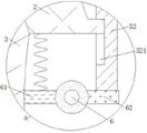 请参阅图1、图2、图4、图5,进一步的,位于进料斗2底端下方的靠近碾米室3壁面的碾米室3前后内壁固定连接固定杆6,固定杆6的外表面活动套接活动环,且靠近碾米室3内壁的活动环侧面固定连接有第一旋转叶61、远离碾米室3内壁的活动环侧面固定连接有第二旋转叶62,第一旋转叶61的顶端与进料斗2的底端之间通过大弹簧连接,第二旋转叶62的顶端与活动杆52的底端接触,固定杆6、第二旋转叶62和63设置起到承接活动杆52和限位块81的作用,为限位块81推动板盖5抬升提供了部件结构基础。