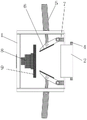 the labels in the figure are: 1. the device comprises a mounting frame, 2, a butt joint barrel, 3, a squeezing machine, 4, a connecting flange, 5, an adjusting oil cylinder, 6, a door plate, 7, a hinged end, 8, an end face oil cylinder, 9 and an end face baffle.