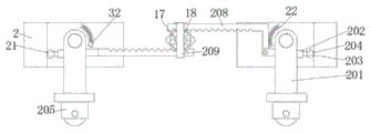 U形定位柱2内端上侧设置转轴连接的收纳杆201,其中收纳杆201一端一侧设置焊接连接的弹性收缩杆202,弹性收缩杆202一端设置焊接连接的抵触块203,其中抵触块203一端贯穿开设卡槽204,卡槽204的内端放置有限制块21,其中收纳杆201下端设置螺钉连接的万向轮205,收纳杆201一端贯穿开设引向槽206,其中引向槽206内端放置有调节滑块207,调节滑块207一端设置铰接连接的齿牙板208。