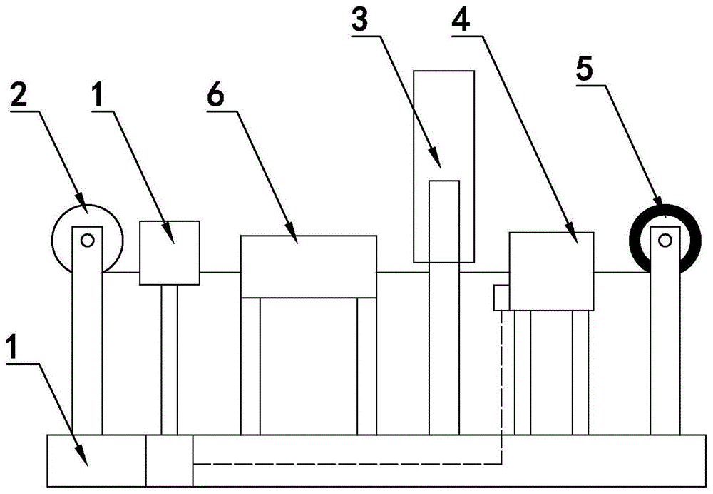 As shown in fig. 1-7, the invention discloses a production device for preparing oxford based on polyurethane solid waste, which comprises a base 1, and a cloth unwinding unit 2, a film coating mechanism 3, a drying mechanism 4 and a winding unit 5 which are sequentially arranged on the base 1, wherein in the specific embodiment of the invention, a cleaning unit 6 is arranged between the square winding unit 2 and the film coating mechanism 3; the cleaning unit 6 includes: