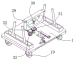 图中:1、底板;2、平台;3、背板;4、滑道;5、滑块;6、活动杆;7、压板;8、L型杆;9、第一滑槽;10、活动块;11、连接杆;12、电动伸缩杆;13、限位杆;14、第一条形块;15、拉板;16、箱体;17、横板;18、液压伸缩杆;19、滚轮;20、第二滑槽;21、第一磁铁;22、凹槽;23、第三滑槽;24、第二条形块;25、第二磁铁;26、拉杆;27、L型柱;28、弧形块;29、弧形框;30、丝杆;31、第一齿轮;32、第二齿轮;33、驱动电机;34、C型杆;35、L型安装板。