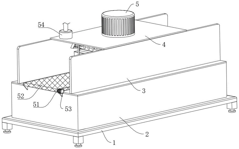As an embodiment of the present invention, the conveying mechanism includes two roller shafts 51, the two roller shafts 51 are respectively rotatably installed above two ends of the collecting shell 2, a filter type conveying belt 52 is jointly connected between the surfaces of the two roller shafts 51 in a transmission manner, one end of one of the roller shafts 51 is provided with a second motor 53, and one end of an output shaft of the second motor 53 is fixedly connected with the end of the adjacent one of the roller shafts 51; during operation, start second motor 53, second motor 53's output shaft drives a roller 51 that links to each other rather than rotating, because the transmission is connected with filtration conveyer belt 52 between two roller 51, therefore when second motor 53 drives one of them roller 51 and rotates, under the conveying of another roller 51, conveniently drive filtration conveyer belt 52 and convey, thereby conveniently transmit to the lead frame of filtration conveyer belt 52 one end to outside transmission device, when second motor 53 reaches the rotation number of turns that sets up, filtration conveyer belt 52 conveys the lead frame to the middle part of device, then conveniently handle liquid injection mechanism and carry out acidizing and water tank 10 to the water spray washing of its surface to the surface of lead frame.
