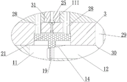 S4、随着冲压头的继续向下运动,上托4、上垫板5和固定板6相对于静止的卸料板33向下运动,上垫板5带动楔形杆29相对于静止的卸料板33向下运动,楔形杆29的楔形面II30抵靠在右斜面15后,推动滑块12沿着滑槽11向左运动,由于滑块12的左斜面14与活动块34的楔形面I20相配合,滑块12带动活动块34向上运动,活动块34带动顶板21向上运动,顶板21带动下凸模22和圆凸台23同步向上运动,当圆凸台23在向上运动过程中,环形弧形面24将筒体36的通孔37的底壁沿径向向外挤压,当处于闭模状态时如图10~12所示,即固定板6压在限位板32时,即可成型出底端面平面宽度为h的成品引深零件;