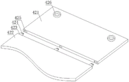 the temporary storage assembly 42 comprises a temporary storage plate A421 and a temporary storage plate B422 which are arranged inside the feeding box 41, a convex block 423 arranged on one side of the temporary storage plate B422, a concave groove 425 arranged on one side of the temporary storage plate A421, one side of the convex block 423 is provided with an elastic connecting piece 424, the outer surfaces of the temporary storage plate A421 and the temporary storage plate B422 are respectively provided with a connecting groove plate 426, the temporary storage plate B422 is clamped and connected with the concave groove 425 through the convex block 423, and the temporary storage plate A421 and the temporary storage plate B422 are both movably connected with the inner wall of the feeding box 41 through a movable hinge 43.