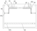 The inside of guide rail groove 62 is provided with lifter 66, the one end of lifter 66 is connected with one-level board 63, one-level board 63 is through lifter 66 and guide rail groove 62 swing joint, the upper surface of one-level board 63 is provided with gangbar 67, gangbar 67 is provided with two sets ofly, two sets ofly gangbar 67 is connected with board A421 and the board B422 of keeping in respectively, still be provided with rubber slab 68 on the surface of riser 61, slab hole 681 has been seted up on the surface of rubber slab 68, slab hole 681 sets up in same vertical plane with face slot 12, the inside of main tank 1 still is provided with baffle 69, be provided with limit hole 691 on the surface of baffle 69, baffle 69 sets up the below at riser 61.